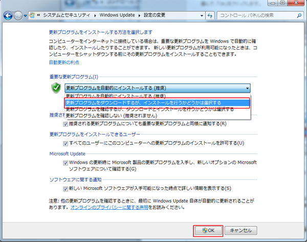 ・「更新プログラムをダウンロードするが、インストールを行うかどうかは選択する」を選んで、「OK」をクリックします。