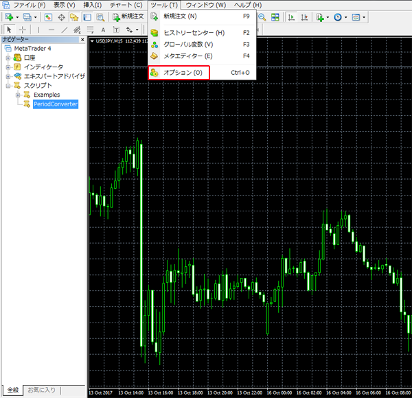 ・MT4の上段タブにある「ツール」から「オプション」をクリックします。