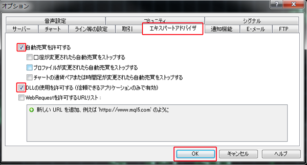 「エキスパートアドバイザー」タブの、「自動売買を許可する」と「DLLの使用を許可する」をチェックします。