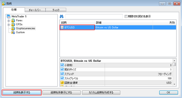 「BTCUSD」を選択して、「銘柄を表示する」をクリックします。