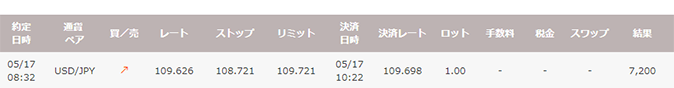 上がり3ハロン 最強のスローターEA!上がり3ハロン 2019年5月収支報告 2019年6月9日 2019年7月3日 この記事の目次 上がり3ハロン 2019年5月収支カレンダー 2019年5月 上がり3ハロンの約定履歴 2019年5月 上がり3ハロンの収益結果 USD/JPY +7,200円 5月のドル円は300pips程度下降する下げ相場でした。 上がり3ハロンはだいたい月に1回から2回程度しかエントリーしませんが、しっかり利益を積み重ねてくれます。 今月も1回のエントリーでしっかり利益確保です! 最強のスローターEAですね! 「上がり3ハロン」で稼ぎたい方はこちら