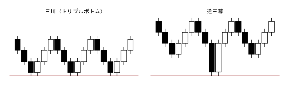 類似で2番目山が一番低いものを「逆三尊」と呼び、三川同様、底サインです。