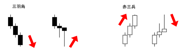 3本の陽線、又は陰線が同じ方向に向かうパターンです。