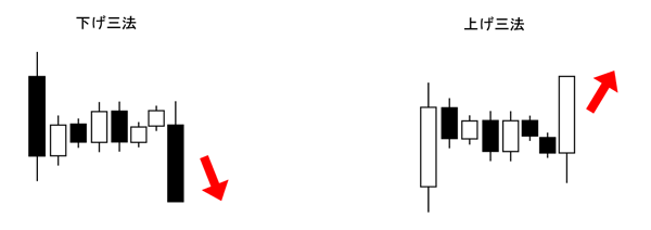上昇相場で大陽線の後、小さな陽線や陰線をはさみ最初の大陽線の高値を上抜く陽線が出現すれば強力な買いサインの事を「上げ三法」といいます。