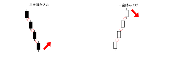 3回マドを空けて勢いよく上昇(三空踏み上げ)、又は下降(三空叩き込み)する場合トレンドが反転。