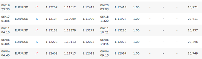 マイアミ午前9時 eurusd サイトからのお知らせ 夜行性EAが本領発揮!マイアミ午前9時 eurusd 2019年6月収支報告 2019年7月5日 2019年7月5日 この記事の目次 マイアミ午前9時 eurusd2019年6月収支カレンダー 2019年6月 マイアミ午前9時 eurusdの約定履歴 2019年6月 マイアミ午前9時 eurusdの収益結果 EUR/USD +92,184円 6月のドル円は250pips程度のボラ幅でレンジ相場でした。 約定履歴を見るとショート、ロング、ともに半々のエントリーでレンジ相場にきっちり対応した感じが見られます。 マイアミ午前9時というだっけあって夜中のエントリーで利益を出していますね。 さすが!です。 「マイアミ午前9時 eurusd」で稼ぎたい方はこちら